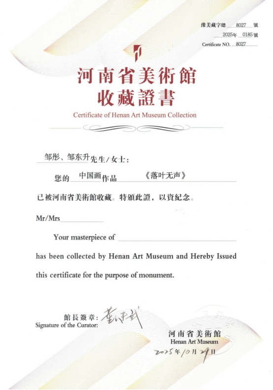 近日,在“纪念中国人民抗日战争胜利暨世界反法西斯战争胜利80周年——河南省美术书法摄影作品展览”中,球王会经理、市美协主席邹东升与青年教师邹彤合作创作的中国画作品《落叶无声》,凭借其鲜明的红色主题与精深的艺术功力,被河南省美术馆正式收藏。